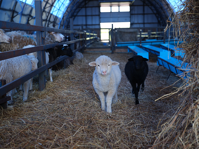 Мы содержим овец в чистом современном ангаре, обустроенным всем необходимым. Основной рацион питания животных — это зерно и сено, а в летнее время — свежая трава на свободном выпасе. Сейчас у нас более 150 голов овец, преимущественно Романовской породы.